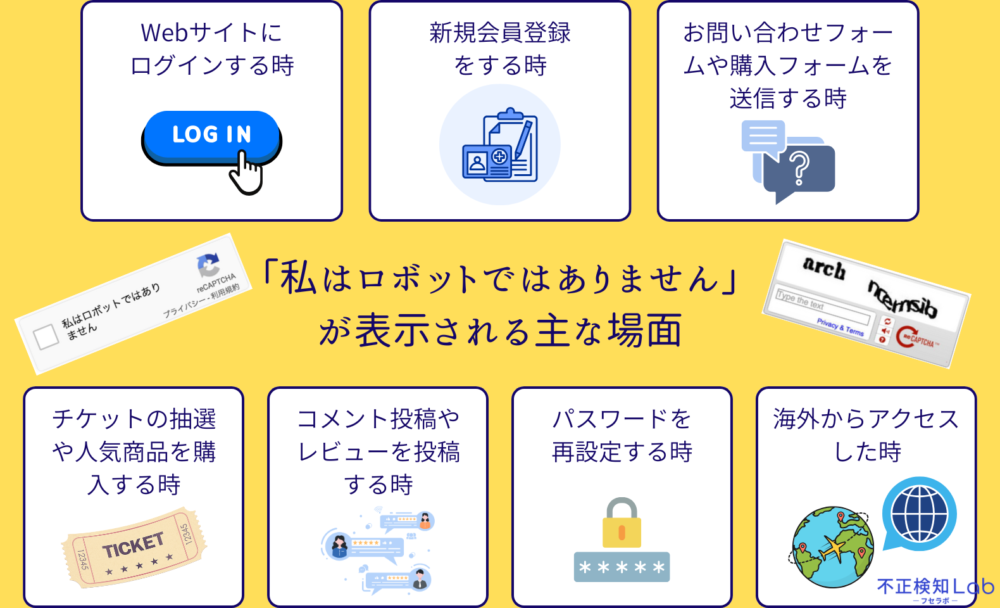 これらの場面で「私はロボットではありません」という認証が表示されることで、サイト運営者はセキュリティを高め、ユーザーの情報やサービスを守っています。