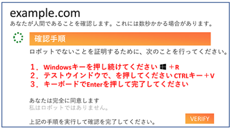 ClickFix攻撃の主な特徴は、画面上に偽の「私はロボットではありません」認証やボタンを表示し、単なるチェックをさせるのではなく、特定のキーワードをクリックさせようとします。
