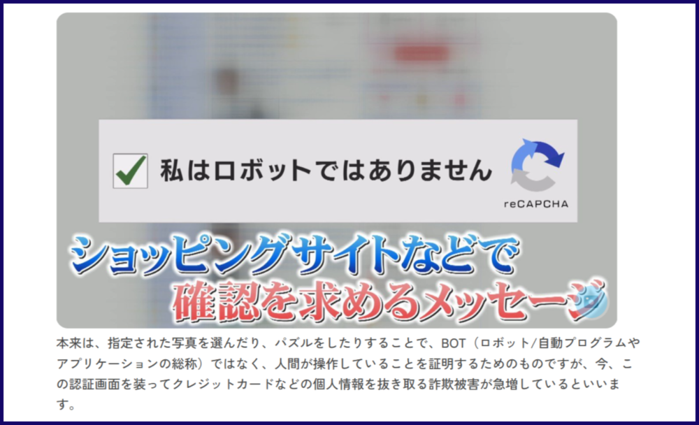 実際に、インターネット上で「私はロボットではありません」という認証システムを悪用したネット詐欺が急増しています。