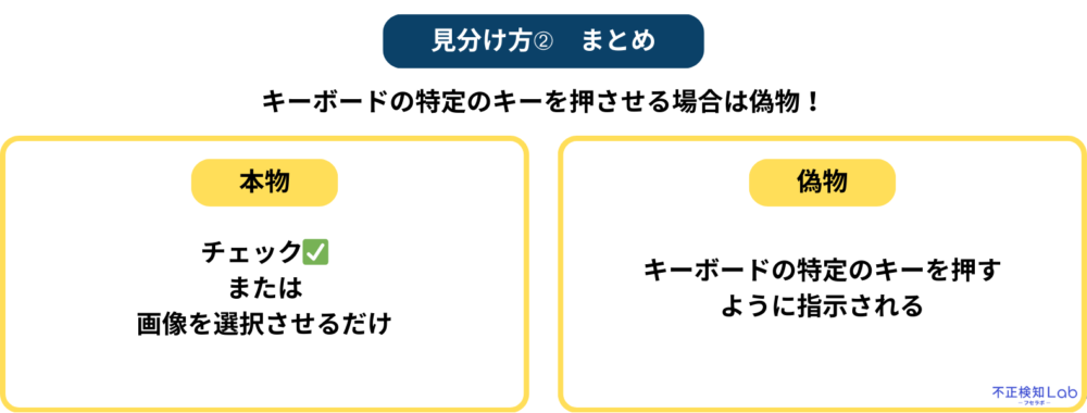 「私はロボットではありません」の認証画面で、キーボードの特定のキーを押すように指示される場合は、ほぼ間違いなく偽物であり詐欺です。