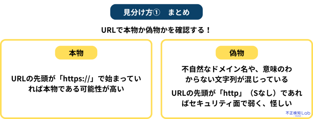 また、http(sなし)で始まるURLはセキュリティ面で弱く、偽物の可能性が高まります。