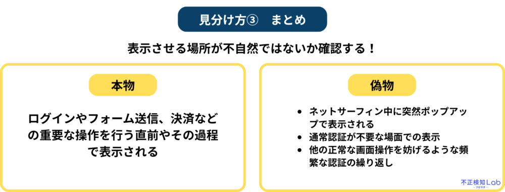 一方で、偽物の認証画面はユーザーを騙すために不自然な場所やタイミングで表示されることが多く、これが判別のヒントになります。