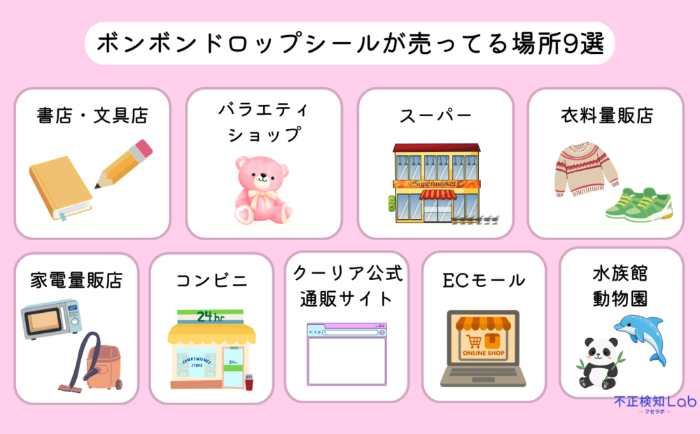ここでは、実際にボンボンドロップシールがどこで売っているのか、代表的な店舗や販売チャネルを9つに分けてご紹介します。