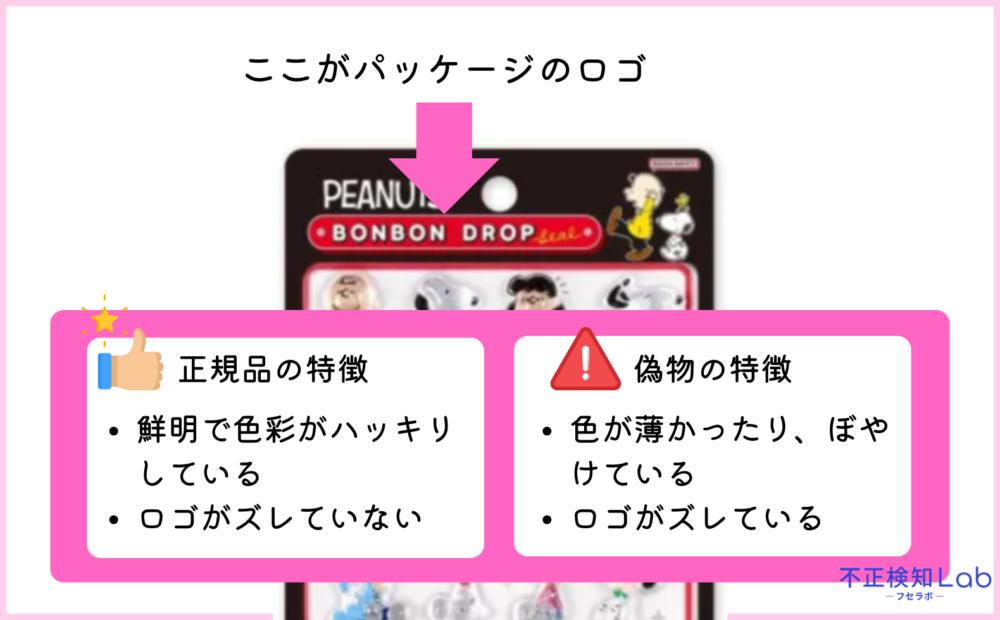 ボンボンドロップシールの正規品と偽物を見分ける際、パッケージのロゴをよく見てください。