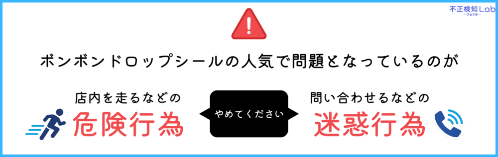 ボンボンドロップシールについての問い合わせ行為や危険行為については、次章でもお伝えしておりますので詳細をご確認ください。