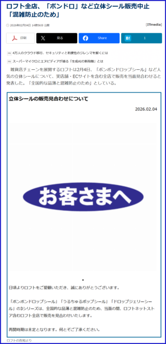 ただし、ここに記載したロフト(Loft)に関しては、2026年2月4日に「ボンボンドロップシール」など人気の立体シールについて、実店舗・ECサイトを含む全店で販売を当面見合わせると発表しています。