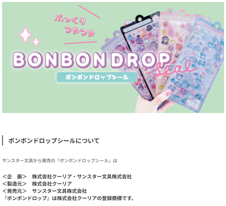 ボンボンドロップシールは、製造元が株式会社クーリアで、発売元がサンスター文具株式会社ですので、クーリア公式通販サイトでは間違いなく正規品が購入できます。