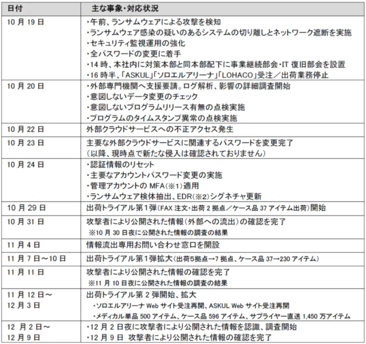 アスクルへのランサムウェア攻撃発生と対応の時系列は以下の通りです。
