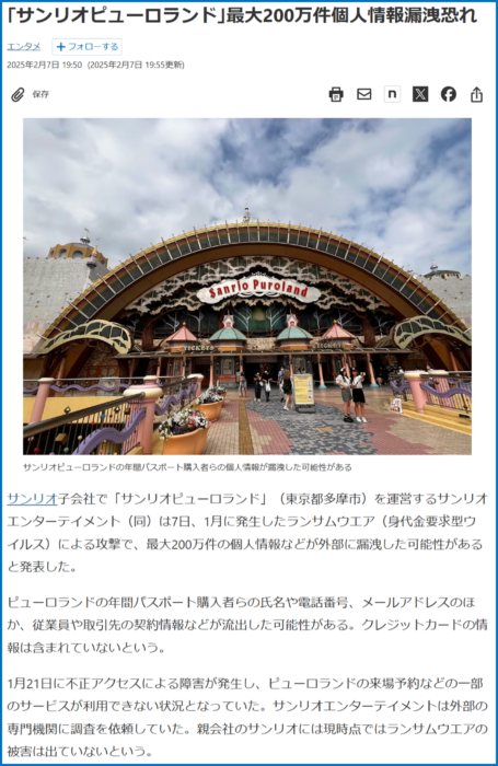 事例の3つ目は、サンリオピューロランドを運営するサンリオエンターテイメントがランサムウェアの被害に遭い、最大200万件の個人情報などが外部に流出した可能性がある被害事例です。