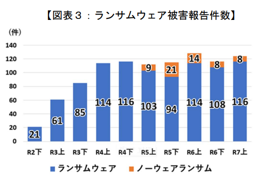 令和2年から令和4年を比較してみると、ランサムウェアの被害は約5倍に増えており、令和7年上期では124件のランサムウェアの被害が報告されております。