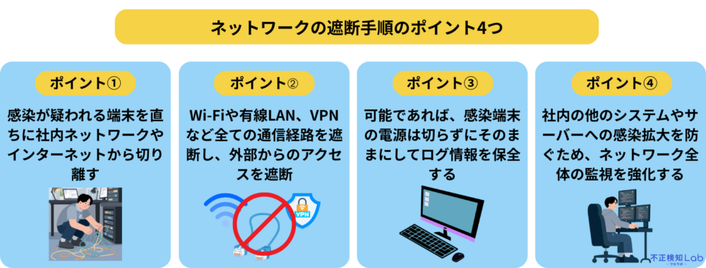 - 感染が疑われる端末を直ちに社内ネットワークやインターネットから切り離す