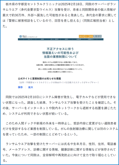 事例の5つ目は、宇都宮セントラルクリニックがランサムウェアの被害に遭い、最大約30万件の個人情報が外部へ流出した可能性がある被害事例です。