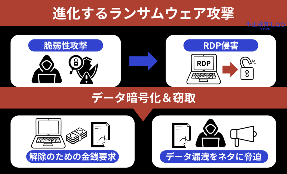 しかし、現在ではソフトウェアの脆弱性を突く手法や、リモートデスクトッププロトコル(RDP)を悪用する手段を駆使しており、データの暗号化だけでなく、データの窃取や公開をちらつかせる「ダブルエクストーション」と呼ばれる手法が一般的になっています。