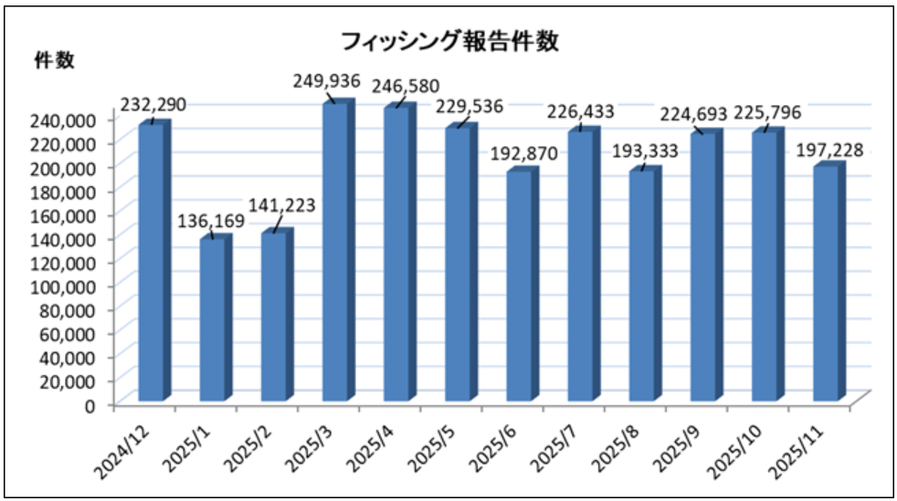 2024年12月~2025年11月までの1年間で、フィッシング対策協議会に報告されたフィッシング詐欺の件数は、約250万件でした。