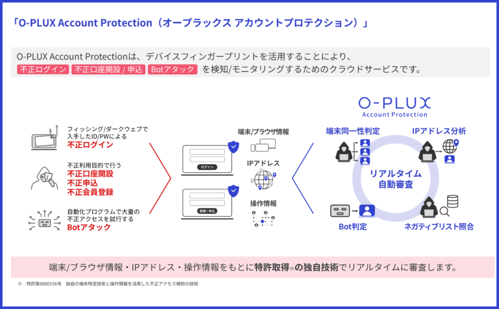 「O-PLUX」の働きを分かりやすく説明すると、Webサイトにアクセスしたユーザーのログイン時の挙動や、アクセスした端末情報などを分析し、他人のなりすまし・Botによる不正ログインをリアルタイムで検知しています。