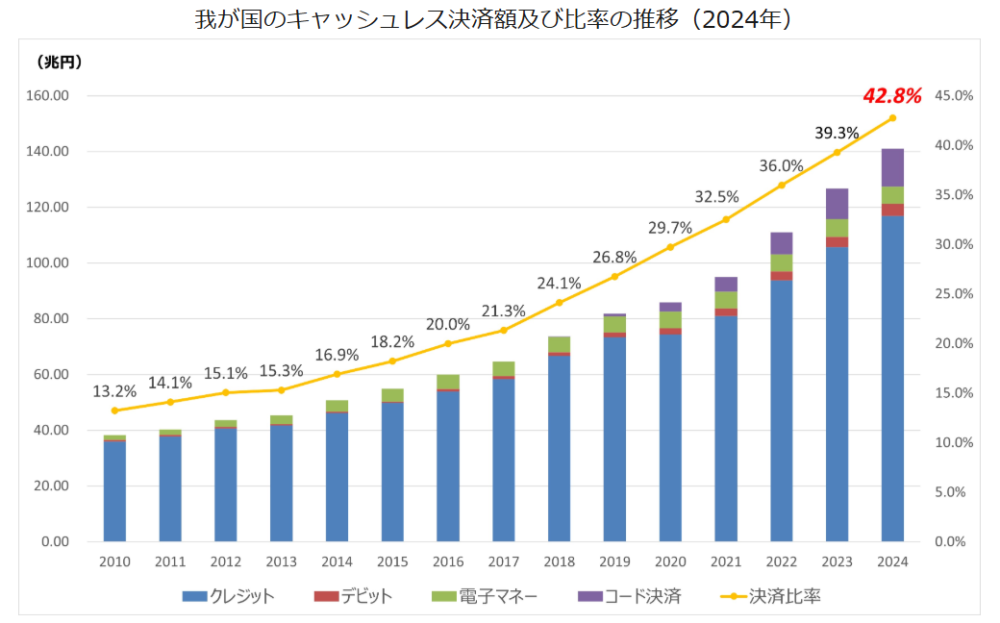 政府の政策として、将来的には世界最高水準のキャッシュレス決済比率80%を目指すとされており、2024年の時点でキャッシュレス決済比率は42.8%にまで増加しています。