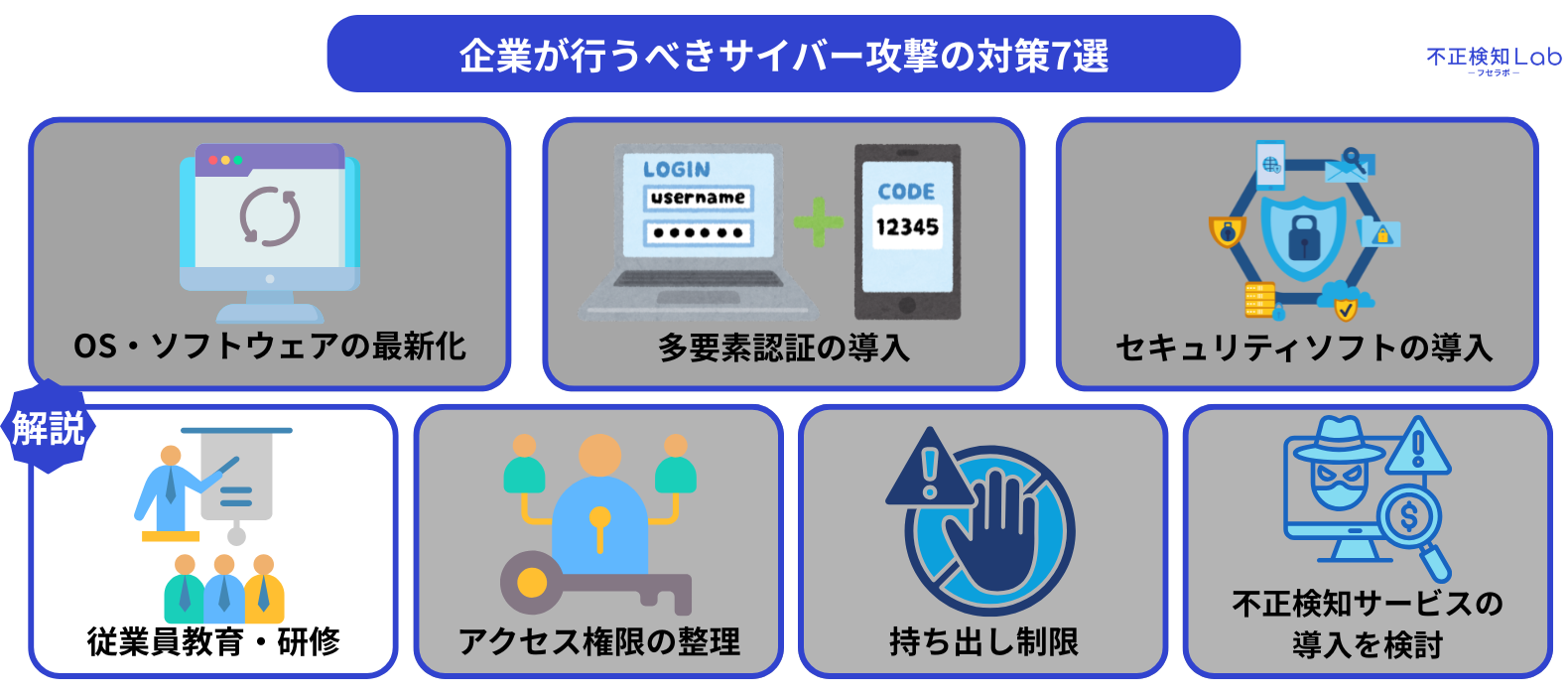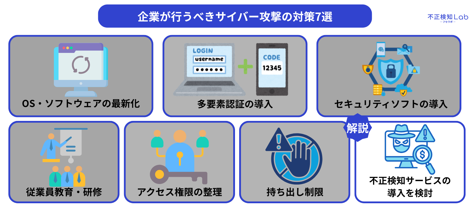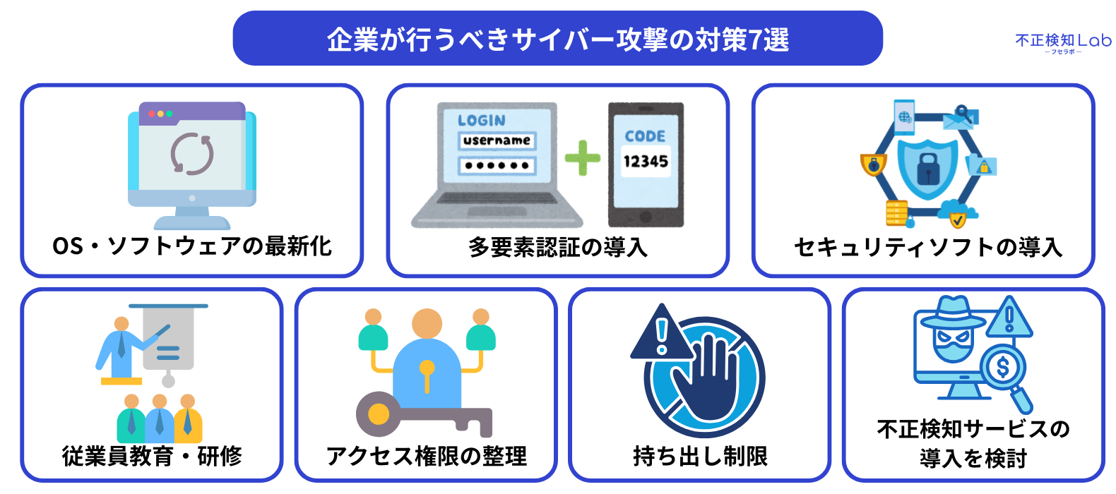 ここからは、企業が行うべきサイバー攻撃の対策7つを解説していきます。