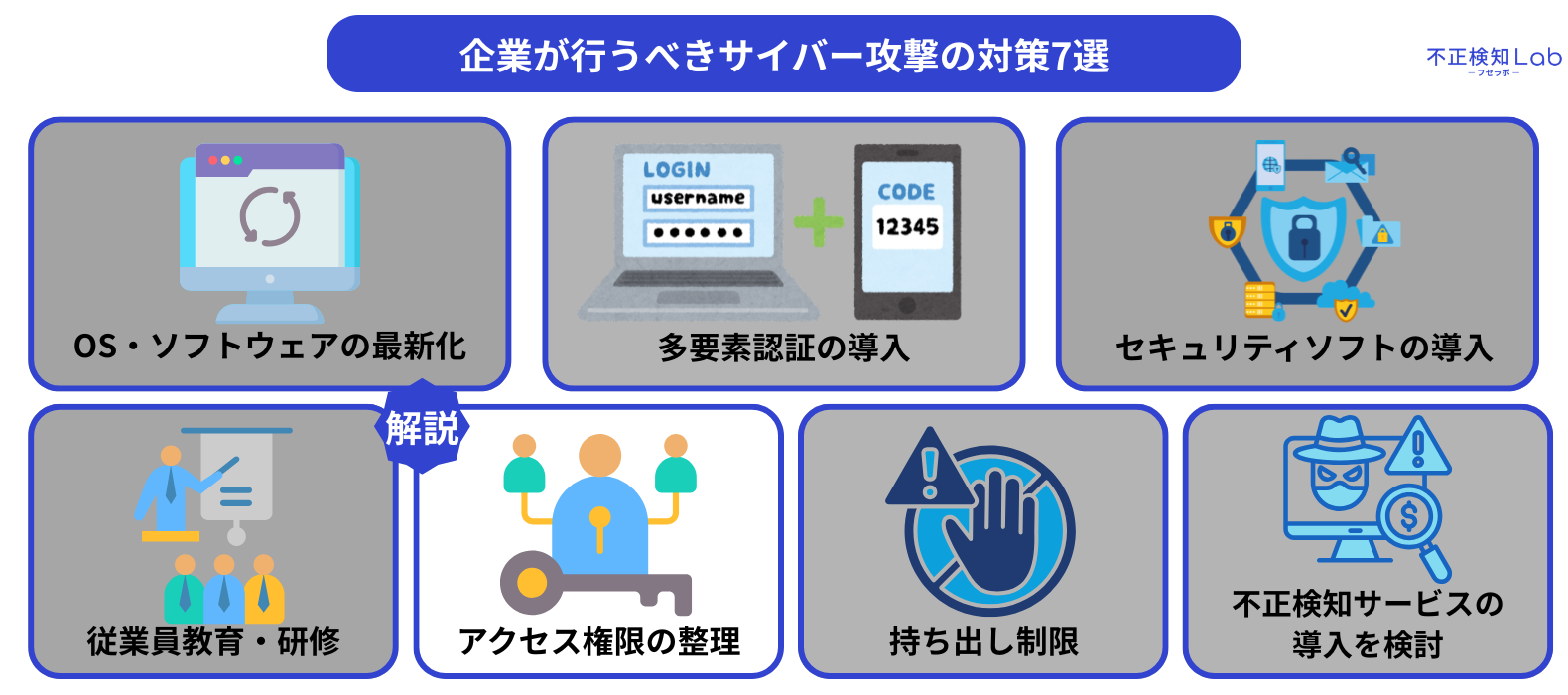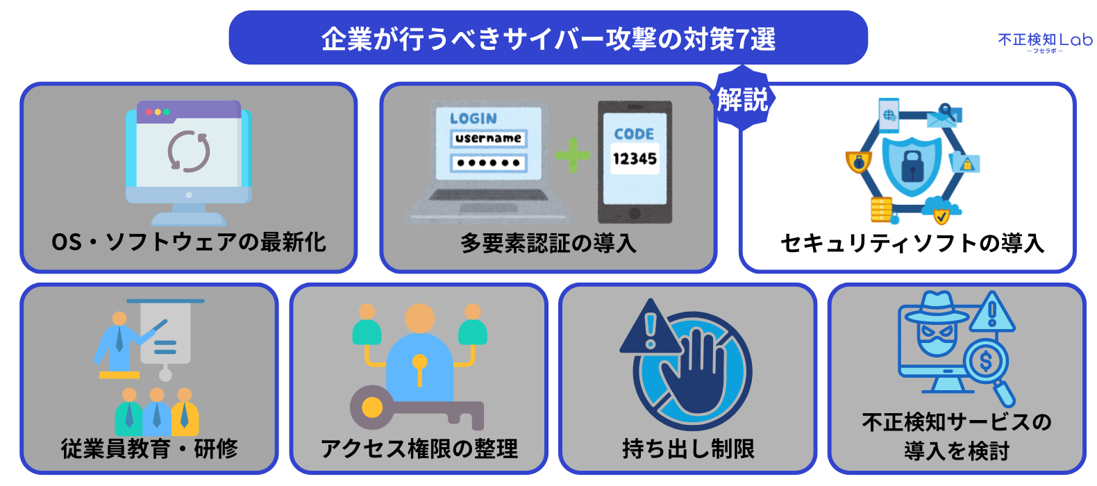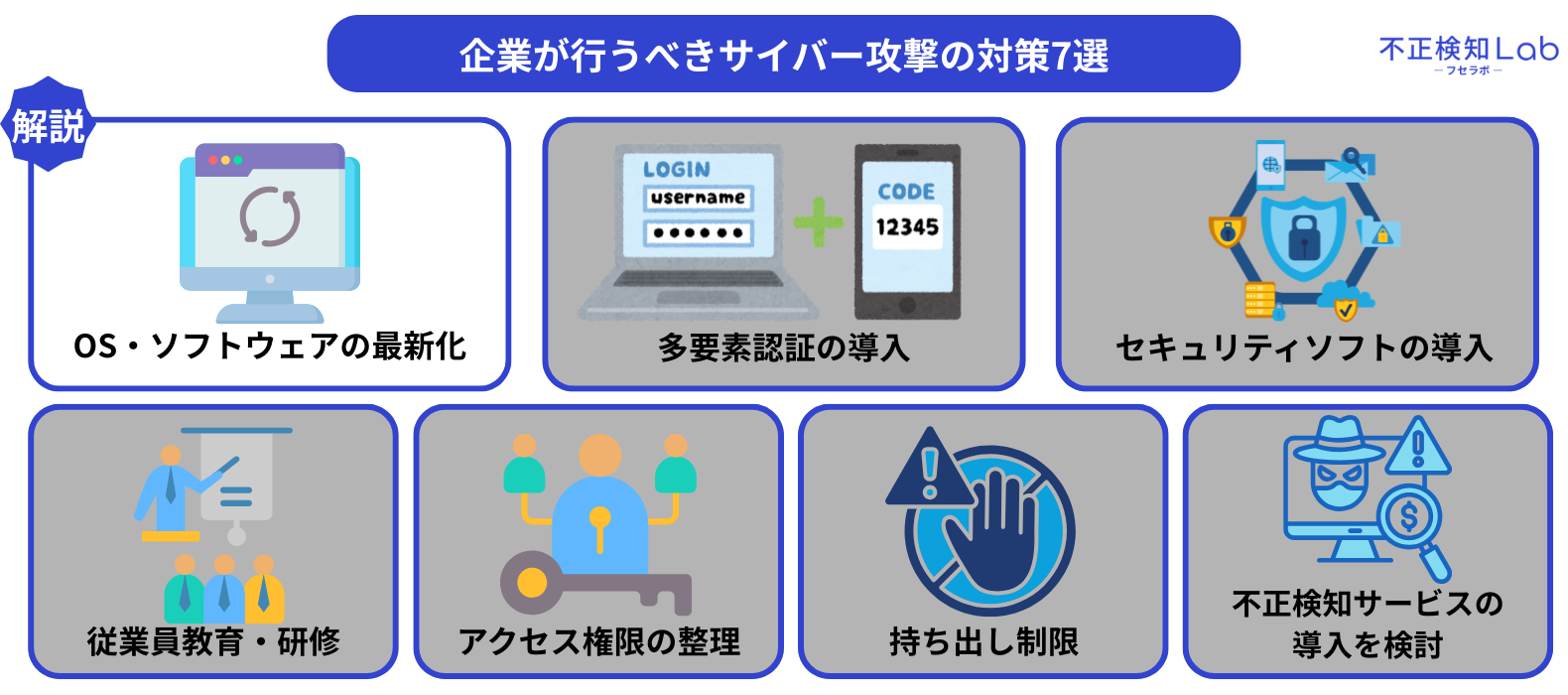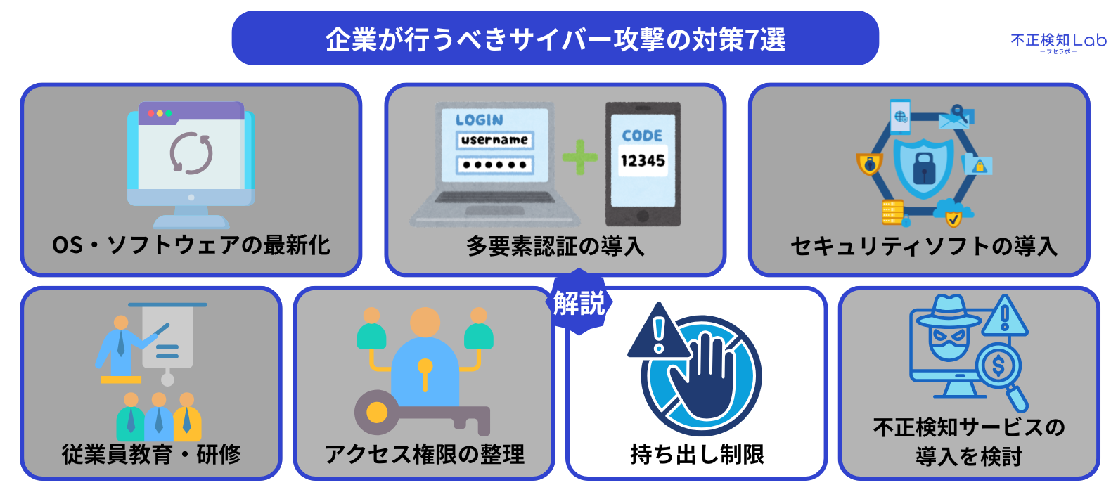 ここからは、企業が行うべきサイバー攻撃の対策7つを解説していきます。