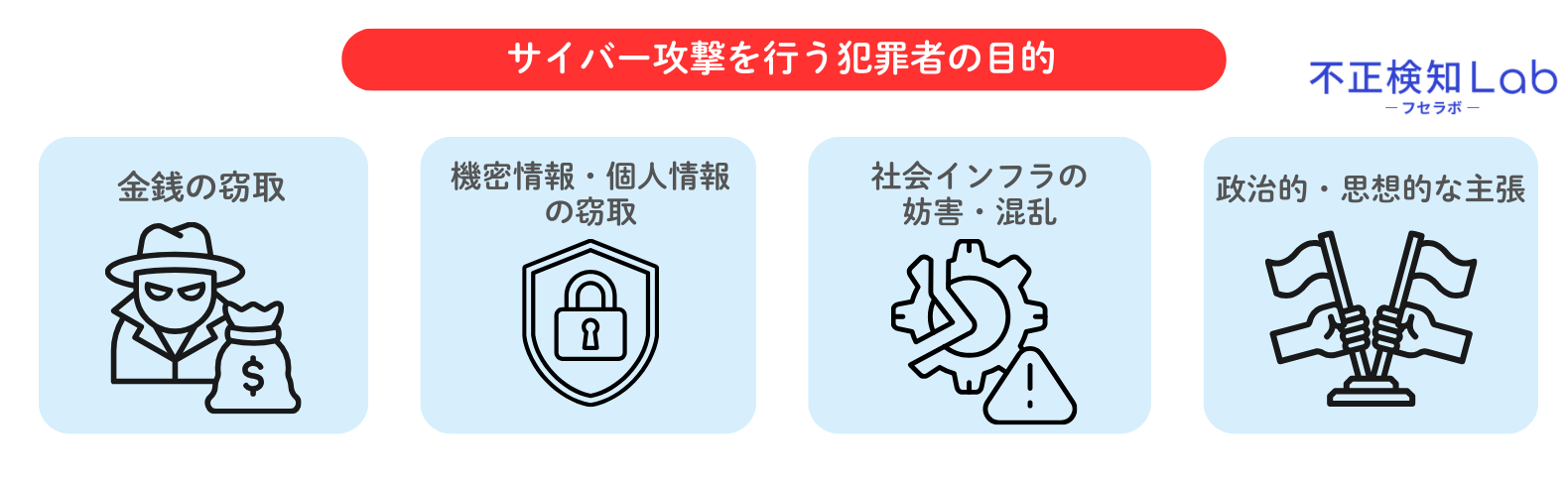 サイバー攻撃を行う犯罪者の目的は主に4つあります。