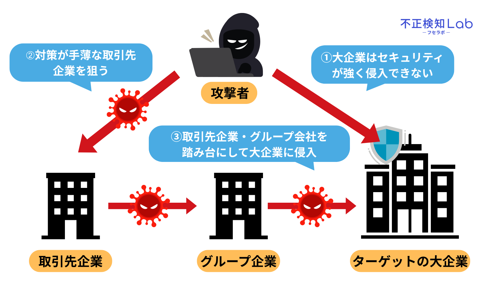 サプライチェーン攻撃とは、大企業はセキュリティが強く侵入できないため、大企業と関わりのあるセキュリティが脆弱な関連会社や取引先を踏み台にして、大企業の情報を狙うサイバー攻撃です。