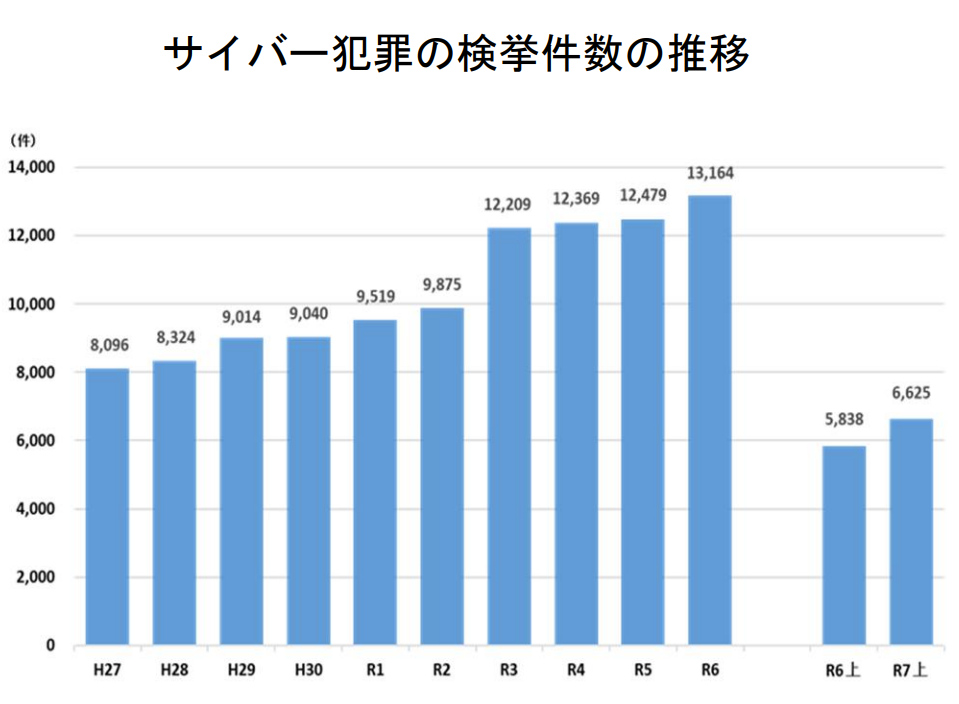 警視庁サイバー警察局の調査によると令和7年上半期におけるサイバー犯罪の検挙件数は、6,625件と増加傾向にあります。