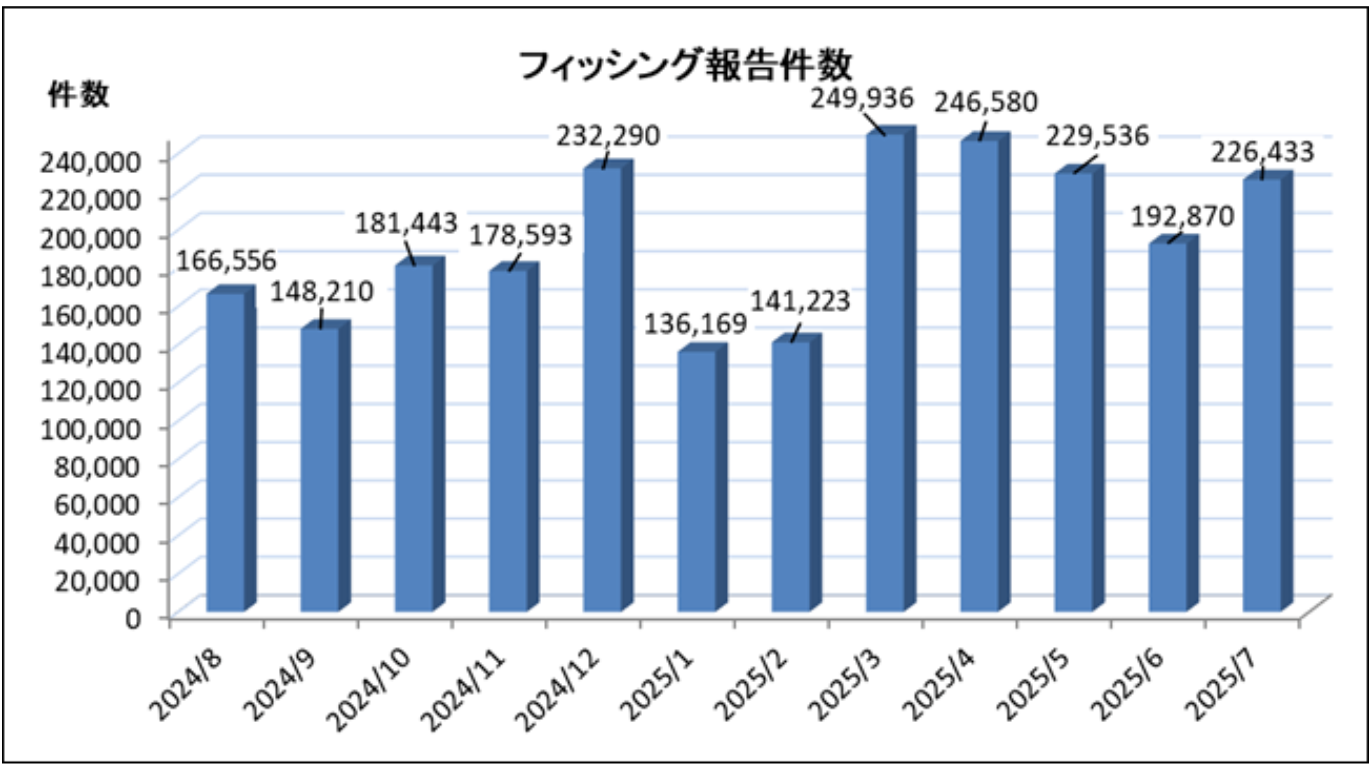 フィッシング詐欺件数は、2025年7月で約23万件と増加傾向にあります。