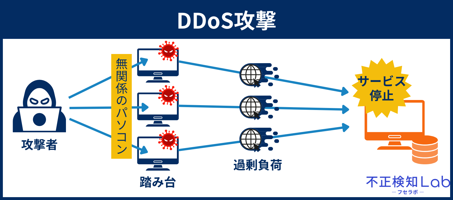 DDoS攻撃とは、ウイルスなどで乗っ取った多数の無関係なコンピューターから、特定のサーバーやネットワークへ一斉に大量のデータを送りつけるサイバー攻撃です。