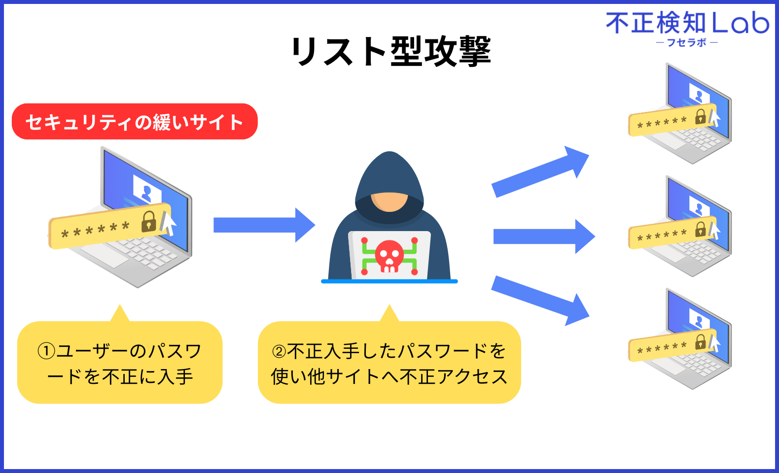 リスト型攻撃とは、セキュリティの緩いサイトからメールアドレス(ユーザーID)とパスワードをセットで盗み出し、盗んだ情報で他のサイトにログインを試みるサイバー攻撃です。