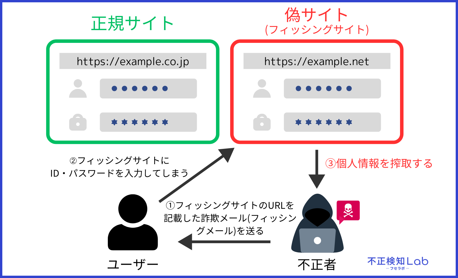 フィッシング詐欺とは、有名な企業などの偽サイトにあなたの住所や電話番号、クレジットカード情報などの個人情報が抜き取られてしまう犯罪の手口です。