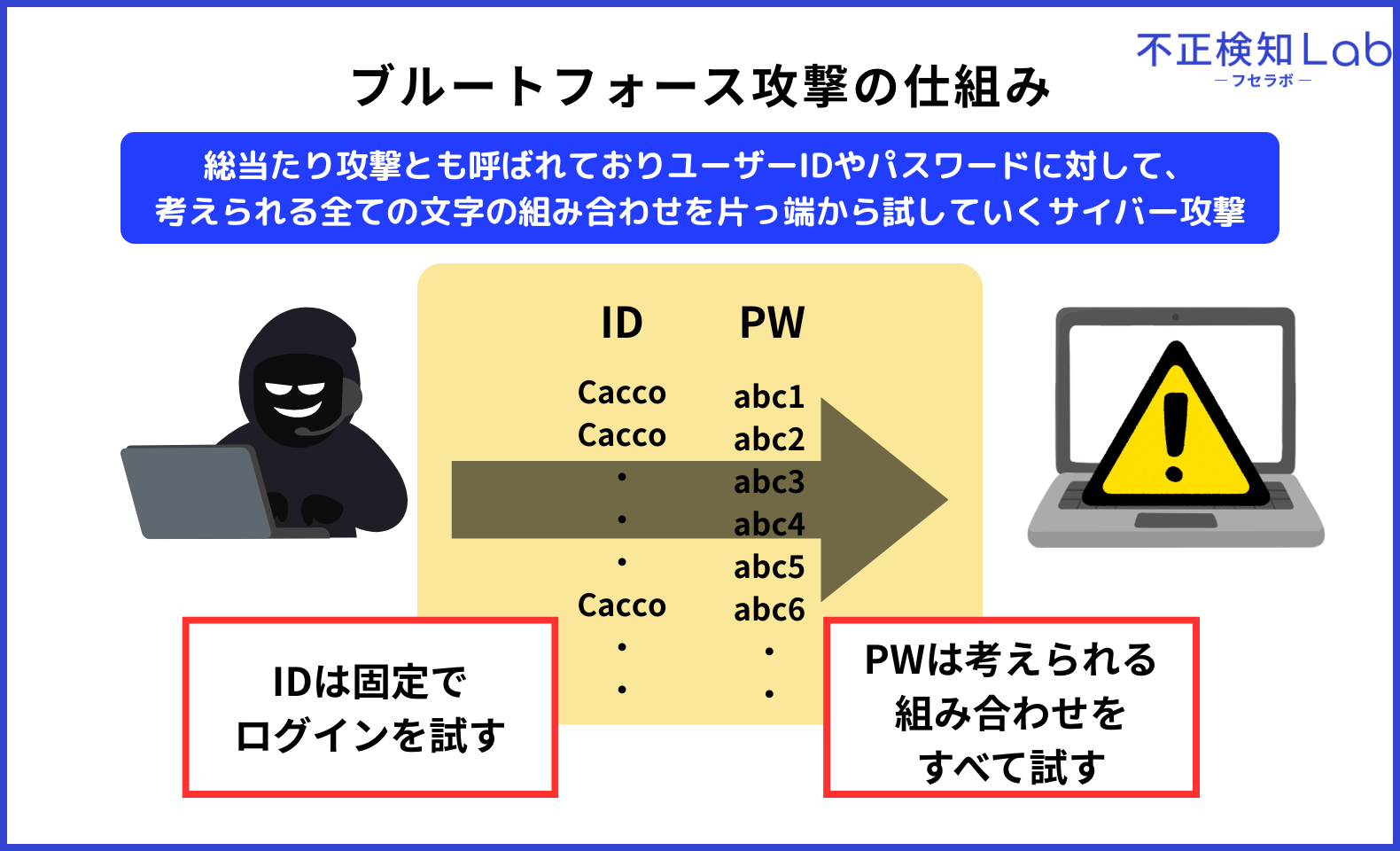 ブルートフォース攻撃とは、総当たり攻撃とも呼ばれておりユーザーIDやパスワードに対して、考えられる全ての文字の組み合わせを片っ端から試していくサイバー攻撃です。