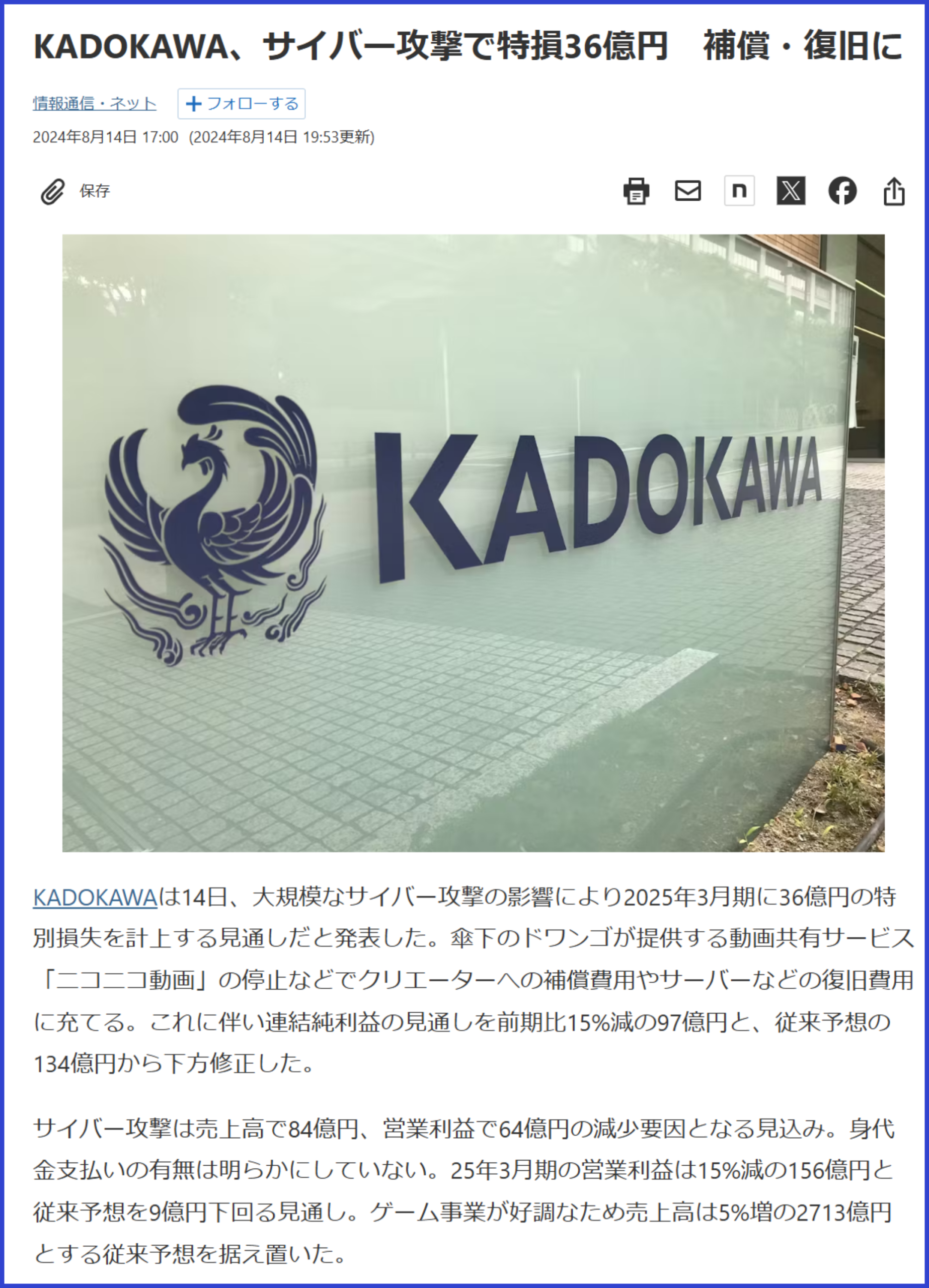 KADOKAWAで大規模なランサムウェア攻撃を受け、サービスの停止や個人情報流出により約36億円の被害が生じる事故が発生しました。