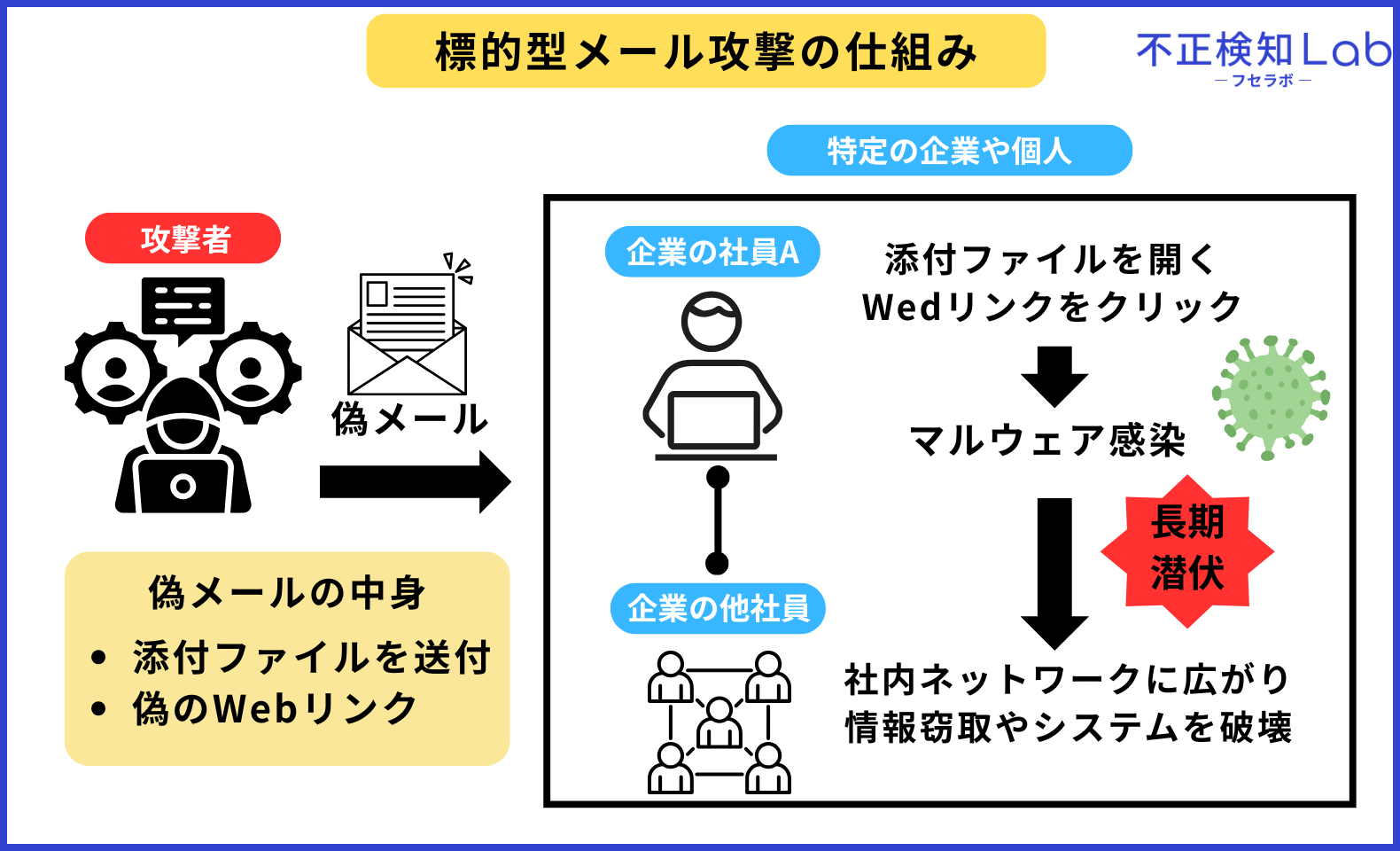 標的型攻撃メールとは、業務メールや関係者を装ったメールでマルウェアに感染させ、長期間潜伏して内部ネットワークへ侵入・探索するサイバー攻撃です。