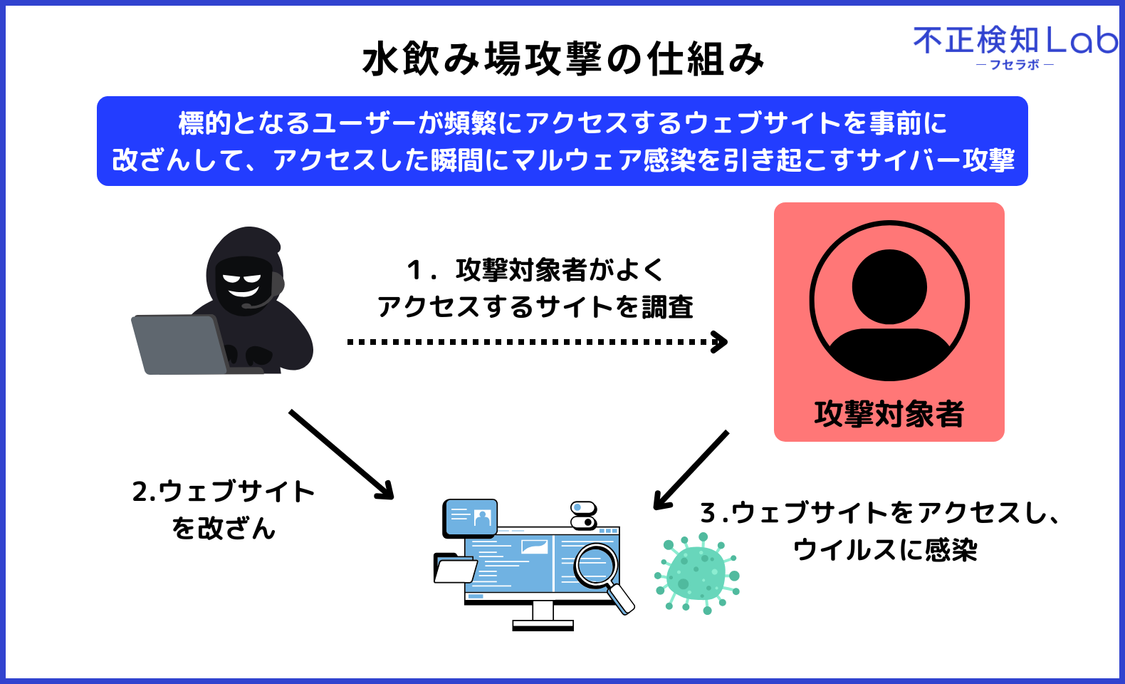 水飲み場攻撃とは、標的となるユーザーが頻繁にアクセスするウェブサイトを事前に改ざんして、アクセスした瞬間にマルウェア感染を引き起こすサイバー攻撃です。