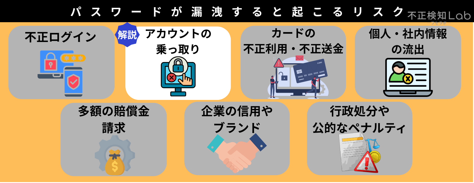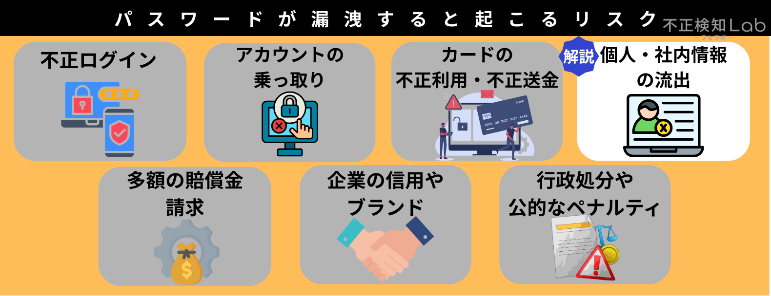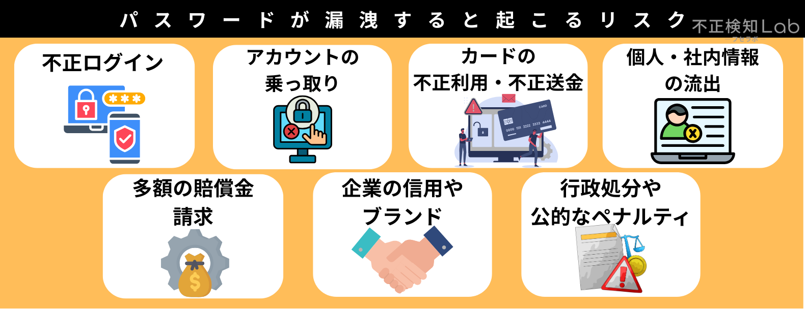 パスワードが漏洩すると、不正ログインやクレジットカードの悪用、機密情報の流出など、連鎖的に多くのリスクが伴ってきます。