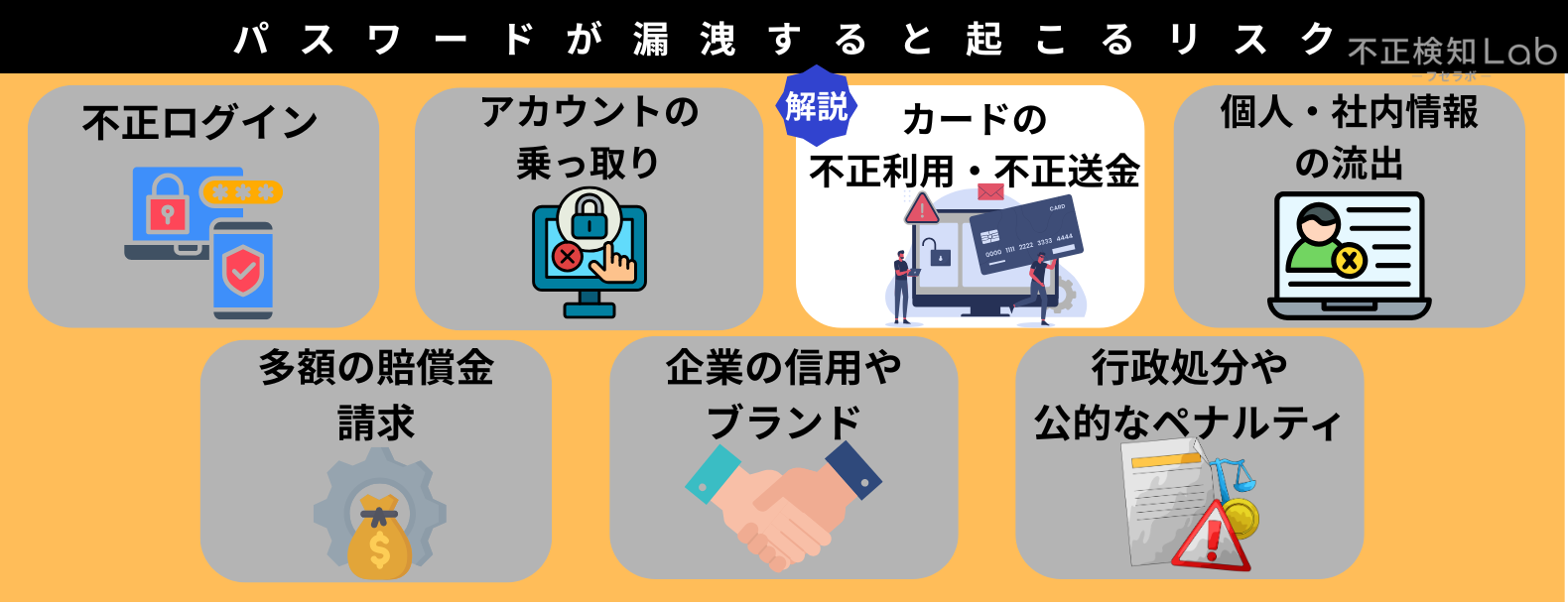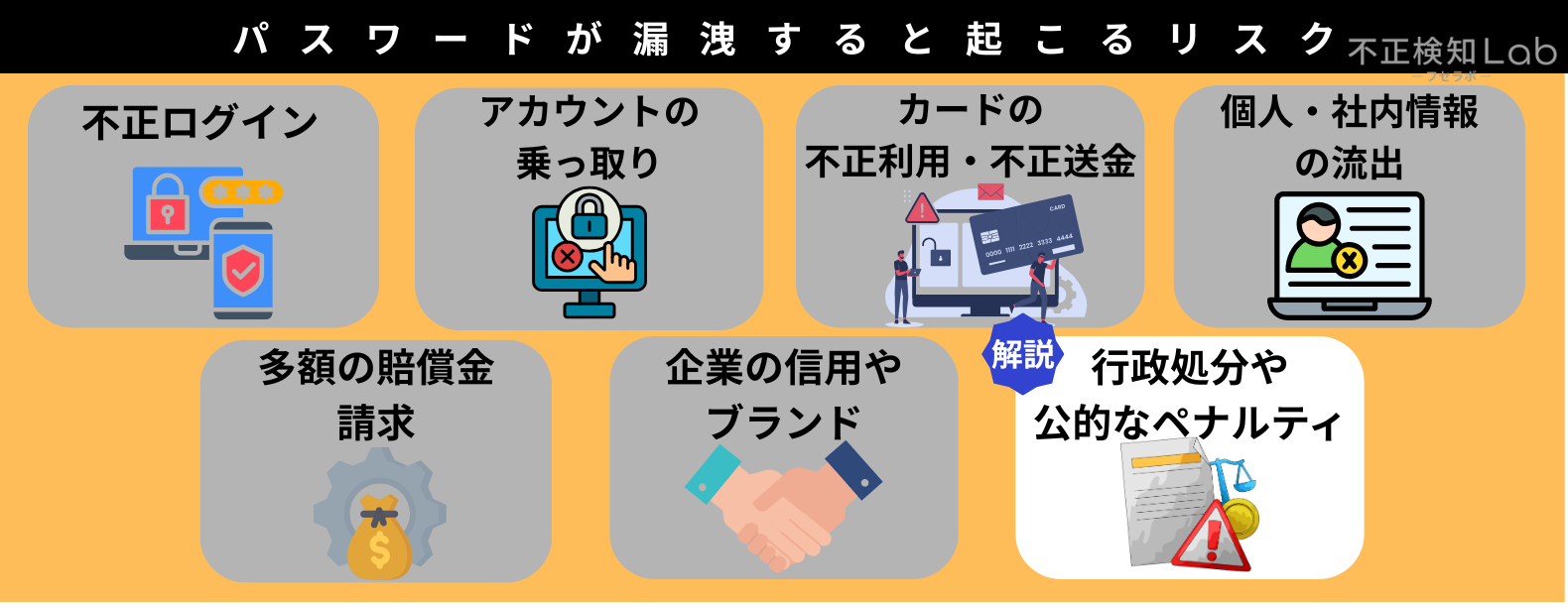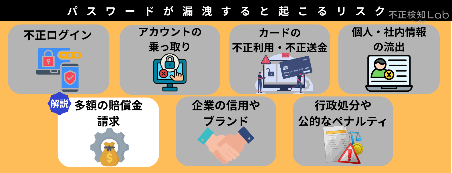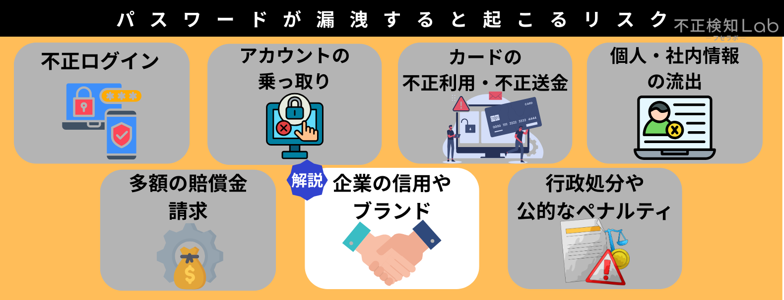 パスワードが漏洩すると、不正ログインやクレジットカードの悪用、機密情報の流出など、連鎖的に多くのリスクが伴ってきます。