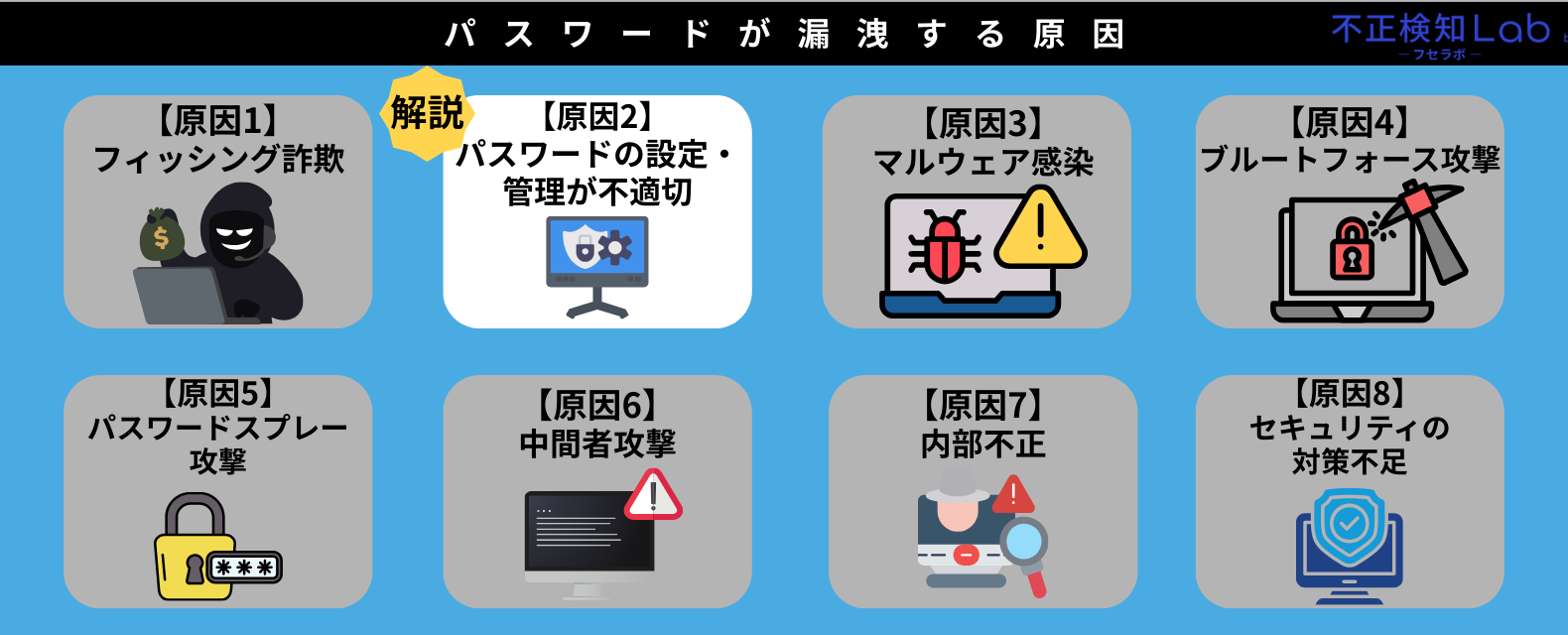 パスワードが漏洩する原因2つ目は、パスワードの設定・管理が不適切なことです。