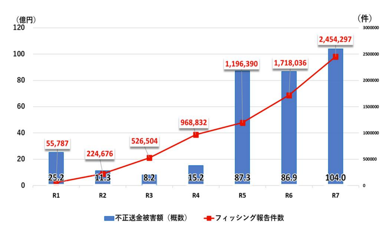 警視庁によると令和7年度の不正送金被害額は、約103億9,700万円と被害額は右肩上がりとなっています。