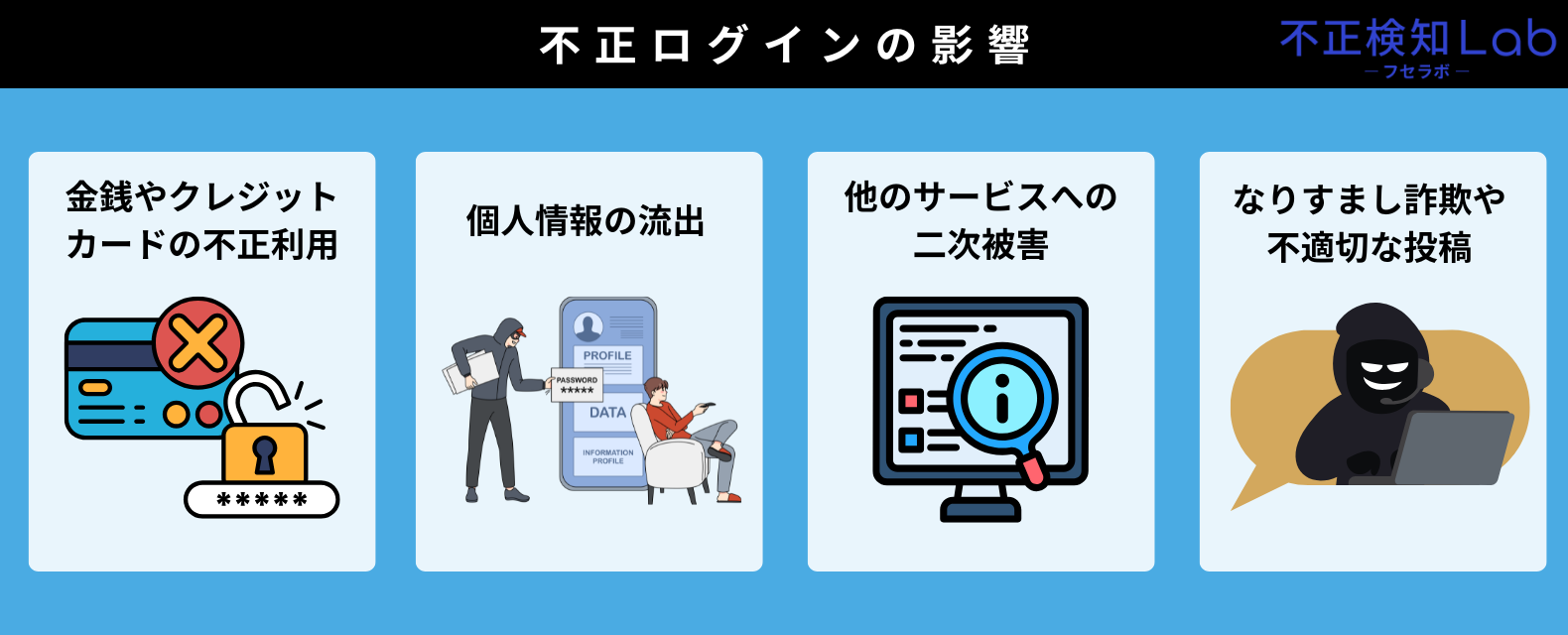 パスワードが漏洩すると起こるリスク1つ目は、不正ログインです。