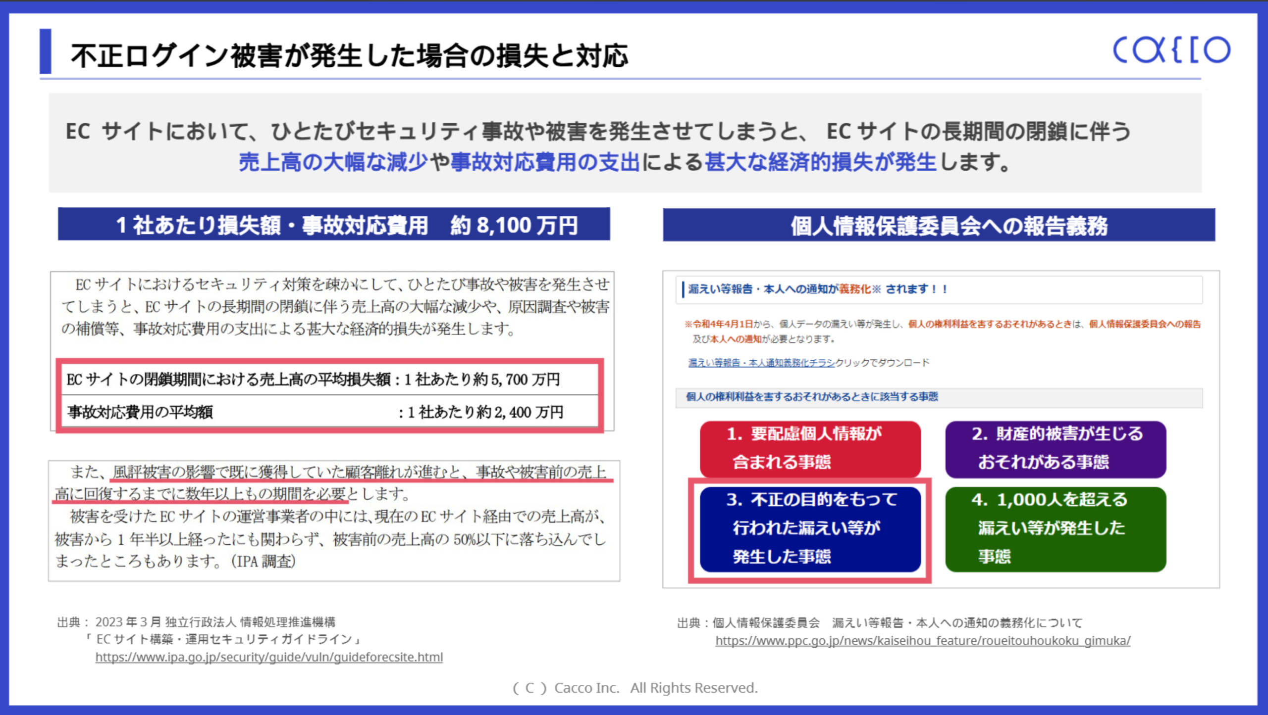 顧客の個人情報やクレジットカード情報が流出すればユーザーへの損害賠償が生じるだけでなく、原因調査やコールセンター設置などの事件対応にもコストがかかります。