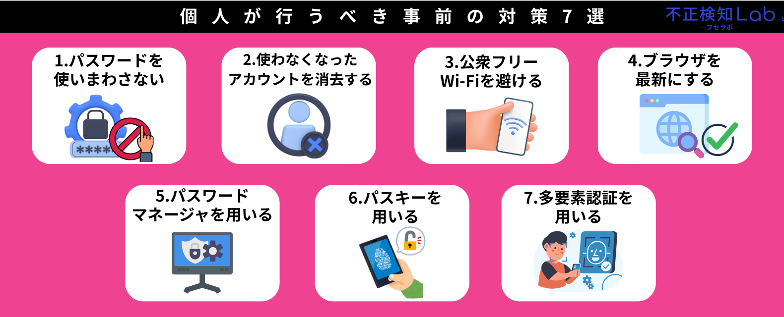 個人が行うべきパスワード漏洩リスクを防ぐ事前の対策は以下の7つです。