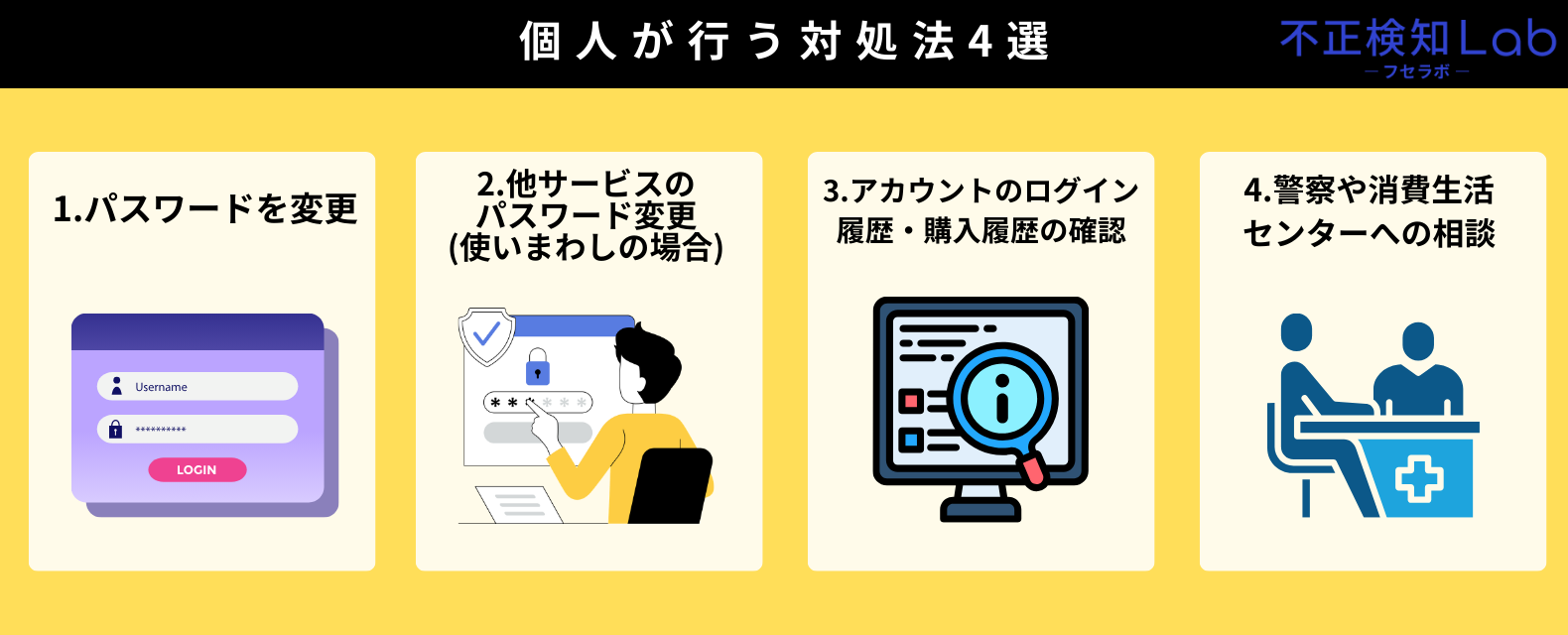 不正アクセスや金銭的な被害が確認された場合は、クレジットカード会社などに連絡して利用停止手続きを行い、警察や消費生活センターへ相談することをおすすめします。