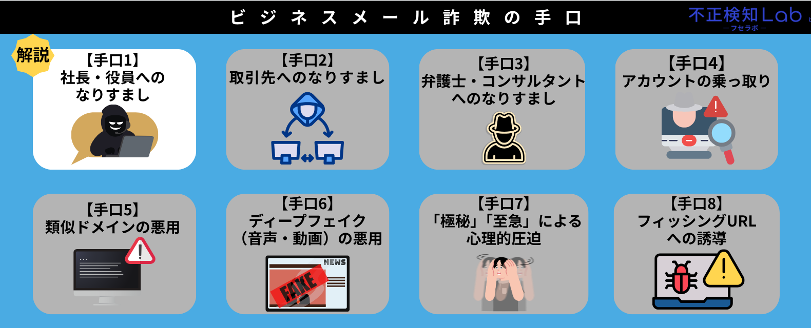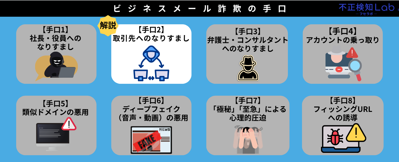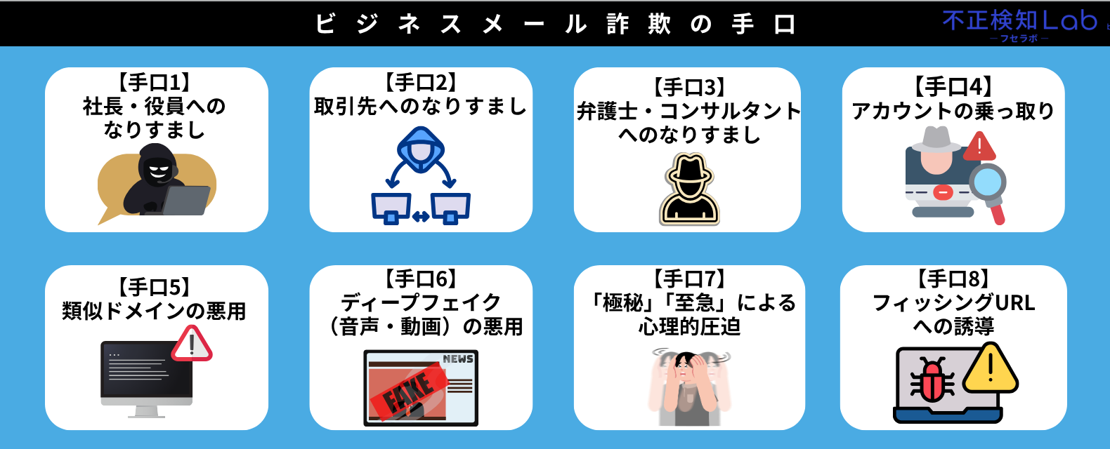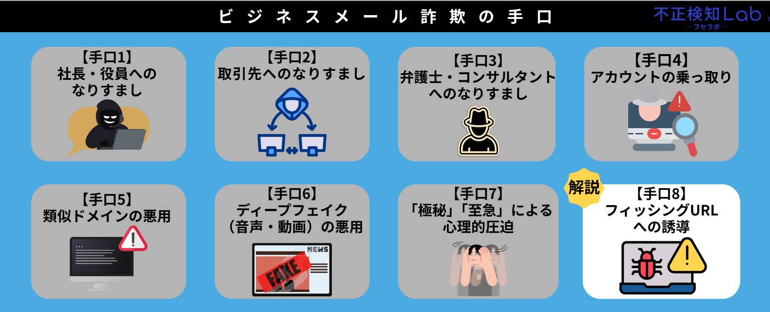 ここからは、ビジネスメール詐欺の8つの手口について解説していきます。