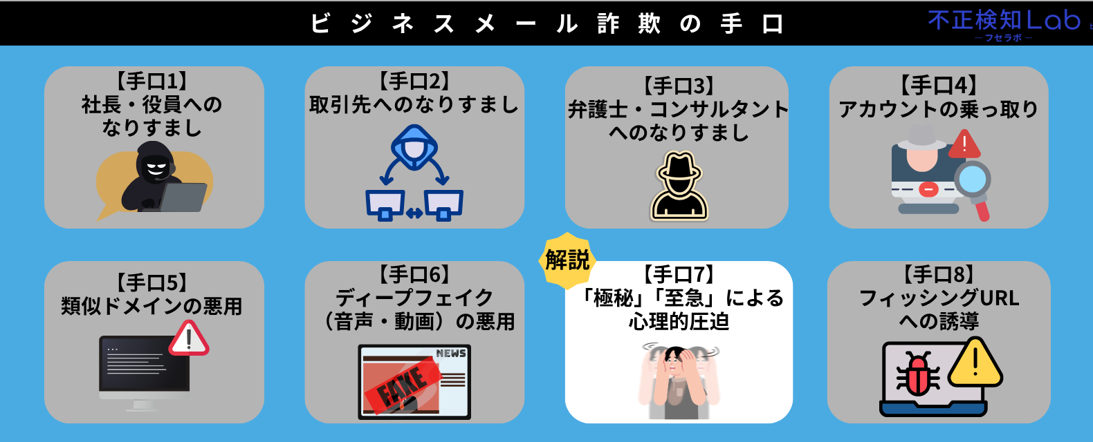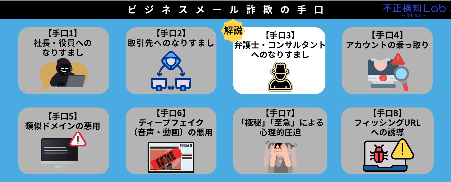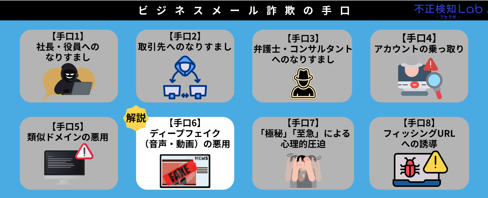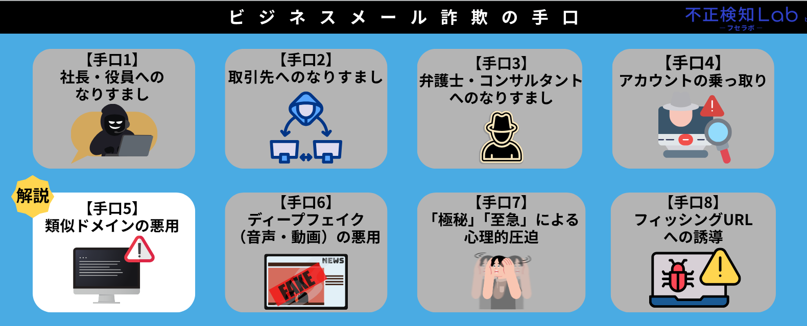 ここからは、ビジネスメール詐欺の8つの手口について解説していきます。