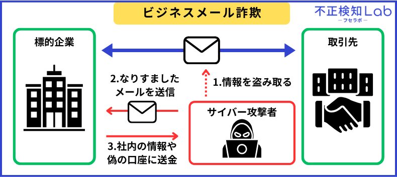 ビジネスメール詐欺(BEC)とは、サイバー攻撃者が標的の企業と取引先の情報を盗み取り、社長や取引先・弁護士などに巧妙になりすましたメールを送り、従業員を騙して偽の口座へ多額の送金をさせる詐欺の手口です。