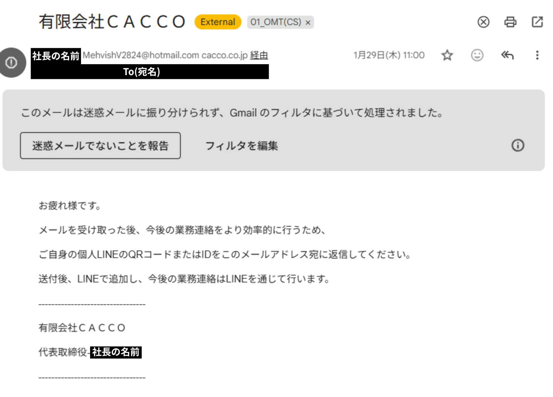 メールの内容を見ると、「有限会社CACCO」や「送信元アドレス」が公式のものと異なっており、詐欺だとわかる内容になっていますが、弊社の社長名が使われており業務に追われて内容をしっかり確認しない場合は騙されてしまう可能性もあります。
