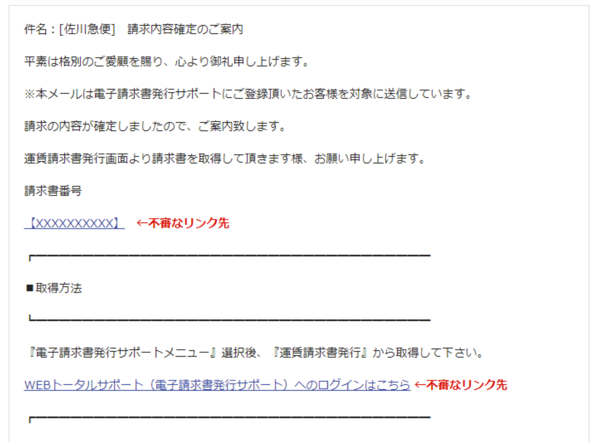 「請求書」という言葉に騙されてしまい、ログインIDやPWを入力してしまうと情報を盗まれてしまいます。