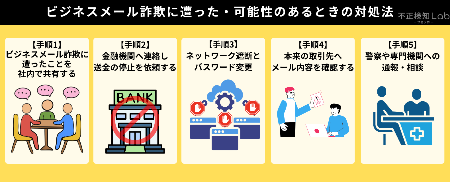 上司や社内でビジネスメール詐欺に遭ったことを報告後、以下の5つの対処を行いましょう。