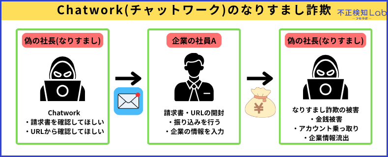 実在する社長や役員になりすまし、Chatworkで接触して偽の請求書で金銭を騙し取ったり、アカウント乗っ取りを狙う悪質な手口です。