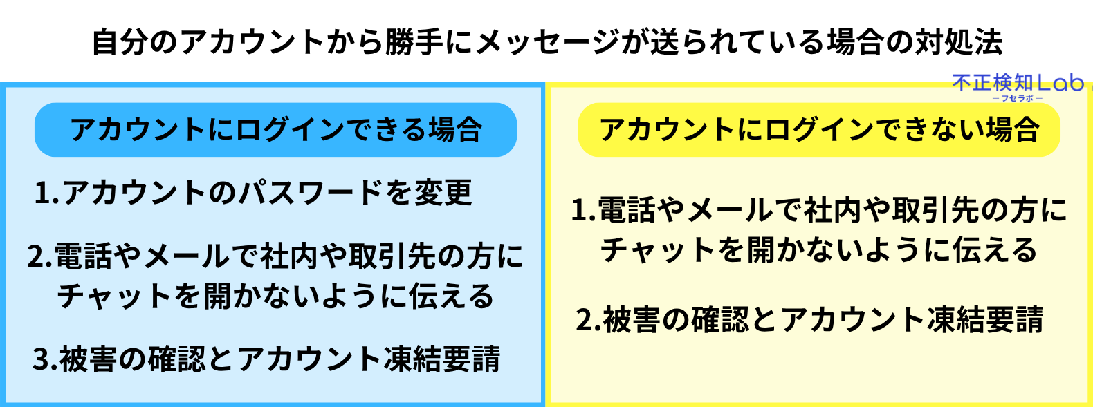 また、なりすまし詐欺で取引先の名前を使用していたら、取引先に不正に利用されてると教えてあげることで、二次被害を防ぐことができます。