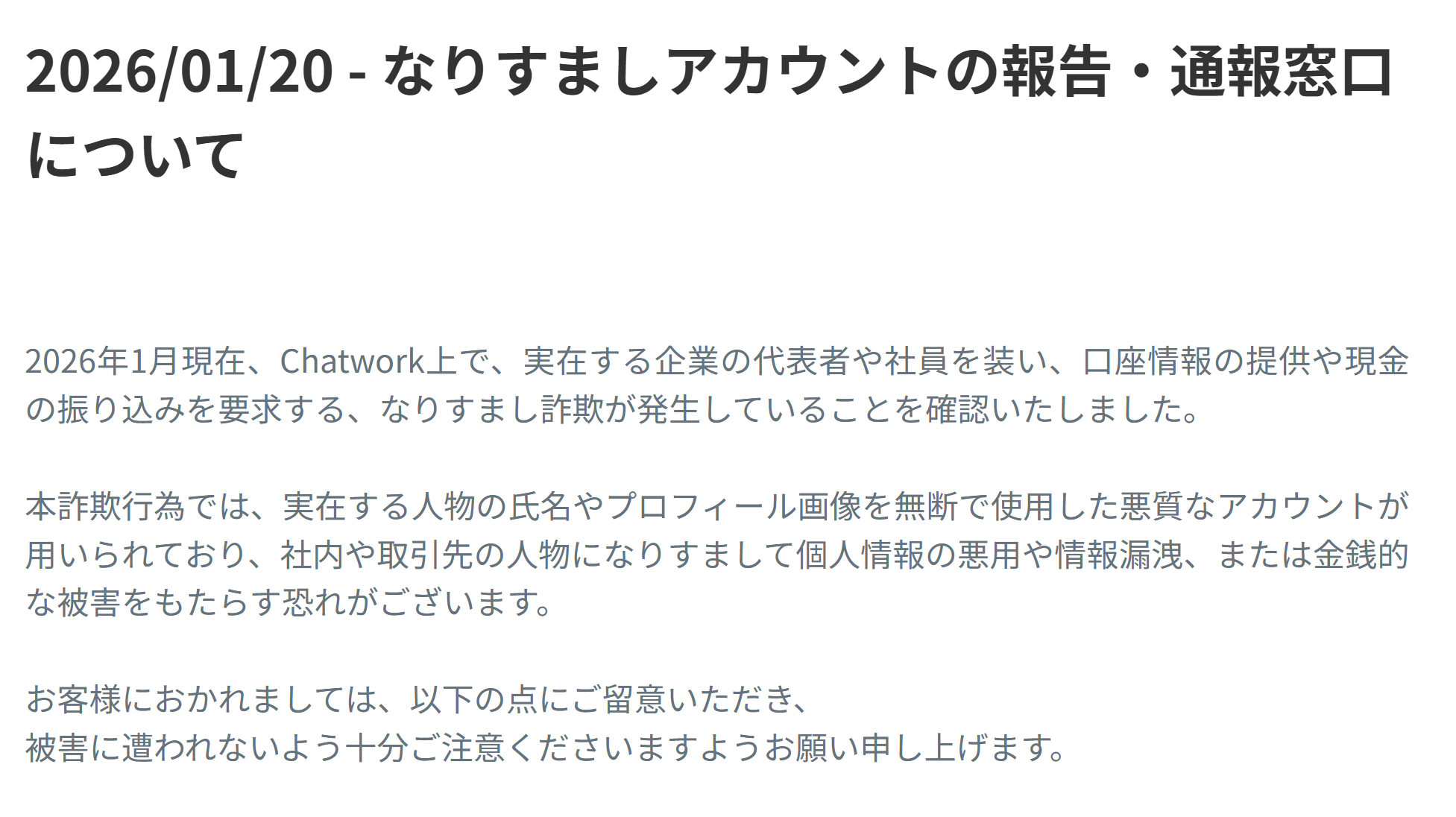 Chatwork(チャットワーク)では2026年になり、なりすまし詐欺が急増しており、公式サイトでも注意を促しております。